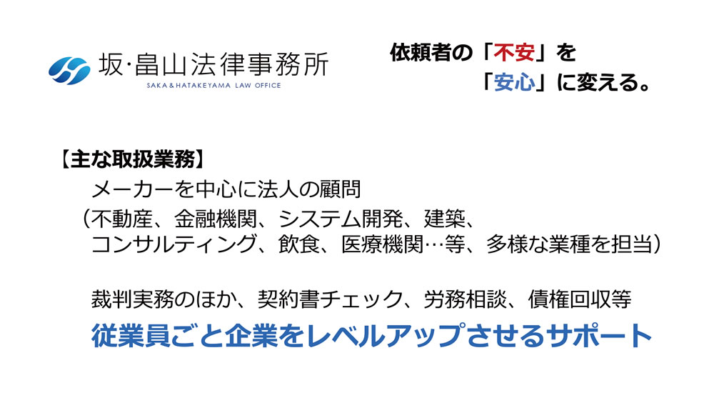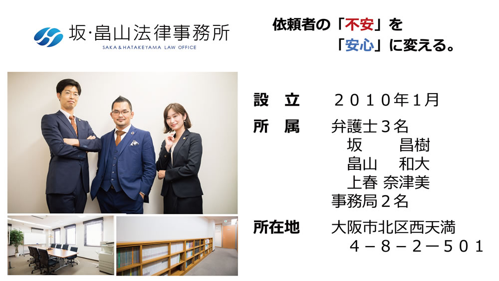 | 所属弁護士 | 坂 昌樹(さか まさき) 畠山 和大(はたけやま かずひろ) |